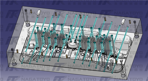 3.水路的水管盡量避免與模具上的其他結(jié)構(gòu)(例如:頂桿、司筒、斜頂、小鑲件、側(cè)邊抽芯、定距分型結(jié)構(gòu))發(fā)生干涉